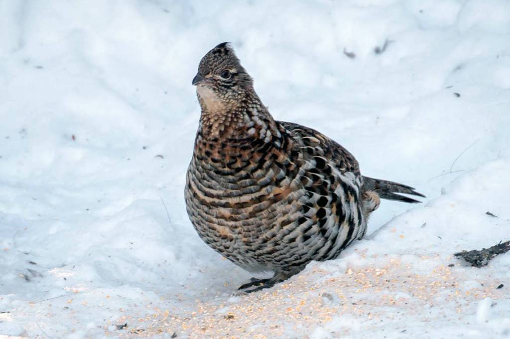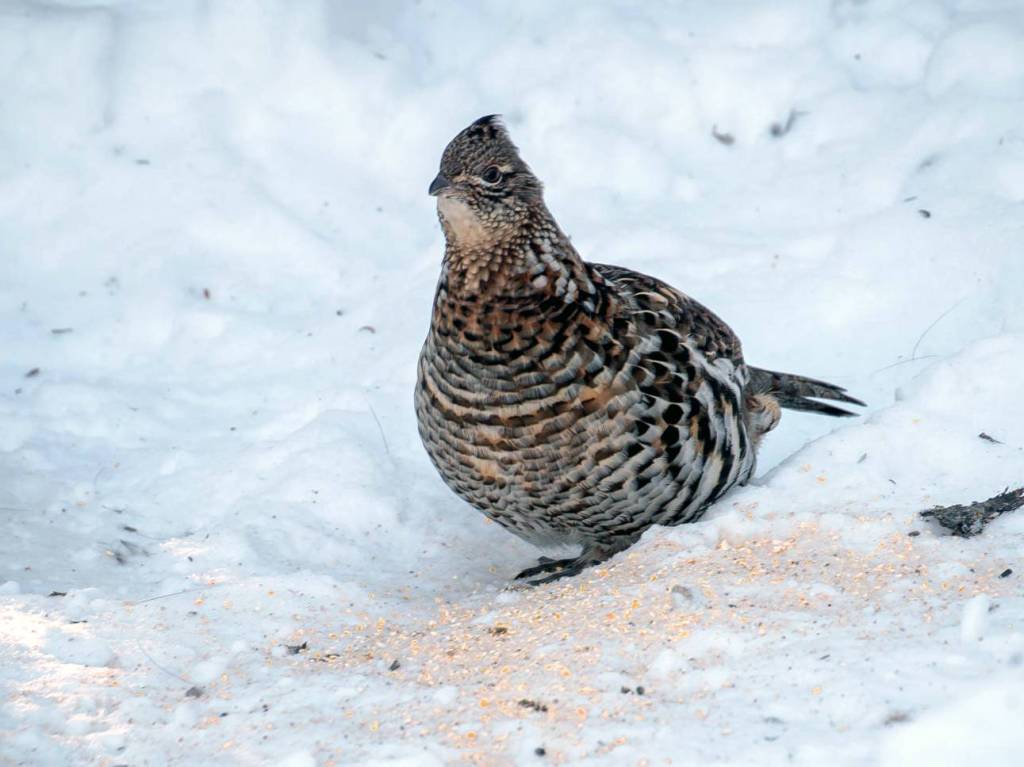 A ruffed grouse male advertises his territory and attracts females by standing with the tail braced on a log or small mound. He “drums” by repeatedly cupping the wings forward and then quickly pulling them back. The sudden compression and release of air pressure produces low-pitched sound as air rushes into a momentary vacuum (cavitation again). It’s a high-energy display, starting slowly and speeding up to a continuous thunder.