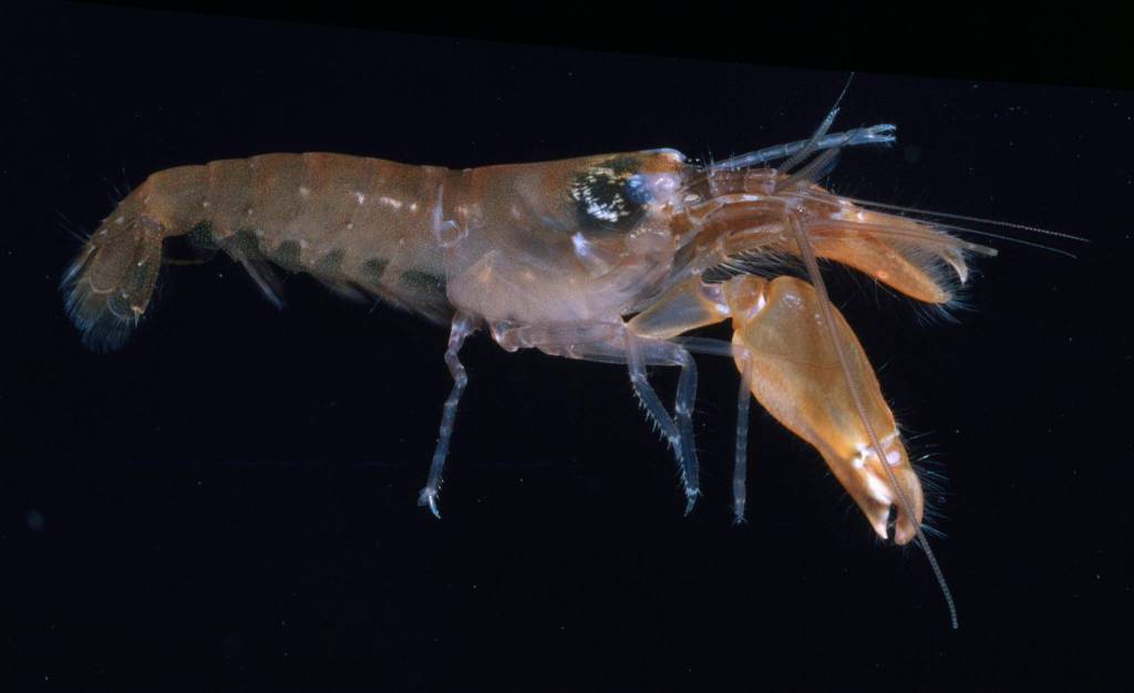 Snapping shrimp make a loud pop with one enormous claw. A very quick closing of that claw forces out a rapid jet of water. There is then a drop of pressure behind the jet and a bubble forms; this is known as cavitation. The bubble implodes with a loud pop when pressure from surrounding seawater rapidly rises again. The sonic shockwave from the popping bubble is used to stun or kill potential prey, such as a small fish or crab.