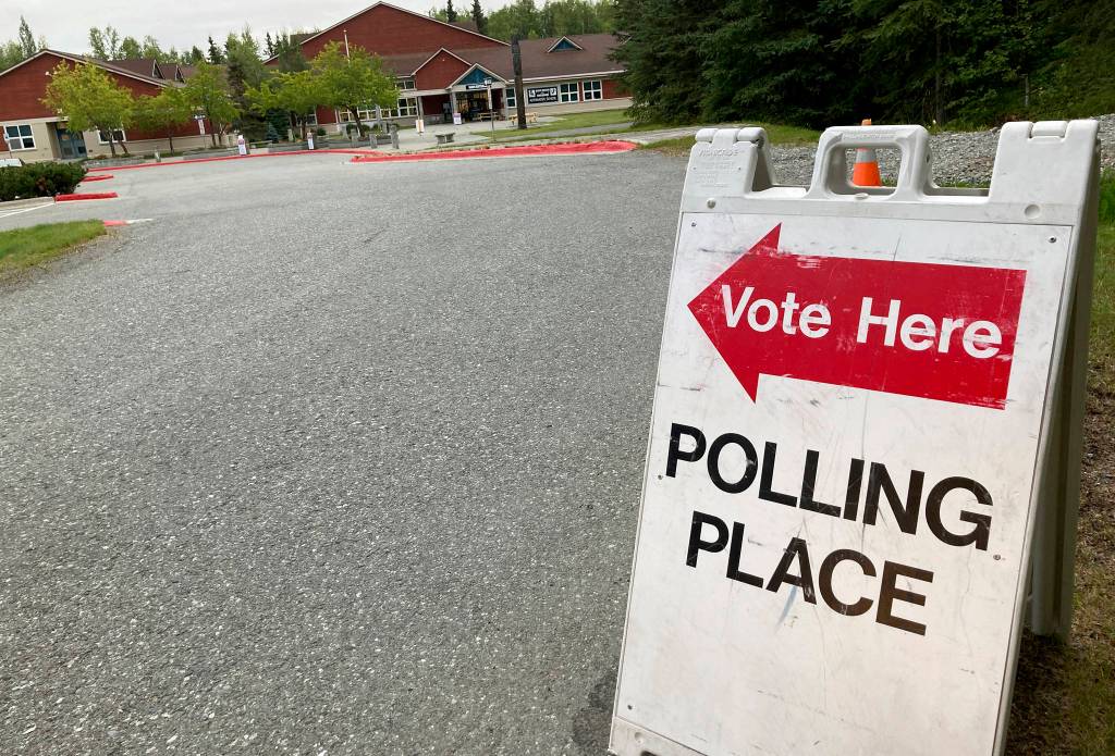 A “Vote Here” sign stands in the driveway outside Benny Benson Elementary School in Anchorage, Alaska, on Tuesday, Aug. 18, 2020. The Alaska Primary election is held Tuesday, when key races included the U.S. Senate, U.S. House and legislative races. (AP Photo/Mark Thiessen)