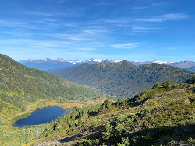 Downtown Juneau, the airport and the Chilkats as seen from the Mount Roberts trail on Aug. 21, 2020. (Courtesy Photo / Denise Carroll)