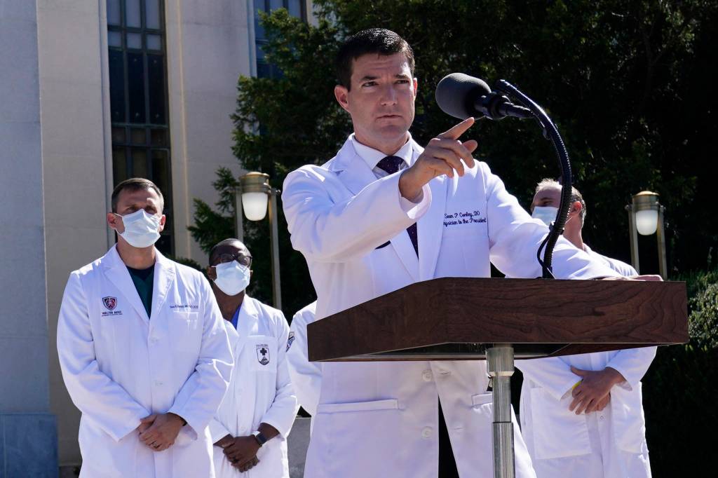 Dr. Sean Conley, physician to President Donald Trump, briefs reporters at Walter Reed National Military Medical Center in Bethesda, Md., Saturday, Oct. 3, 2020. Trump was admitted to the hospital after contracting the coronavirus. (AP Photo / Susan Walsh)
