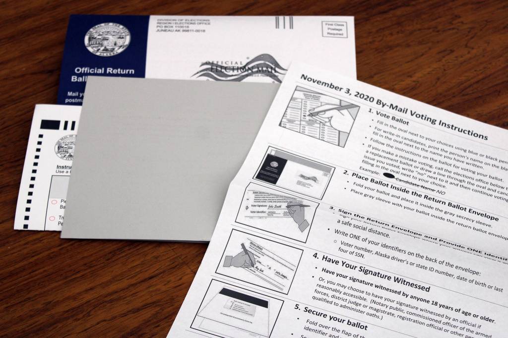This photo shows an Alaska ballot, return envelope and by-mail voting instructions. Step No. 4, having a signature witnessed, is being debated with opponents saying requiring a witness creates an unnecessary hurdle for voters who do not live with someone 18 or older. (Ben Hohenstatt / Juneau Empire)