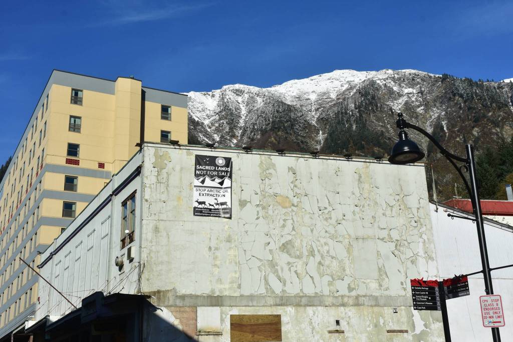 A banner protesting resource extraction in the Arctic was hung from a building in downtown Juneau on Wednesday, Oct. 21, 2020. On social media, activists posted photos of the banner in cities around the state and nation, and even as far away as London. (Peter Segall / Juneau Empire)