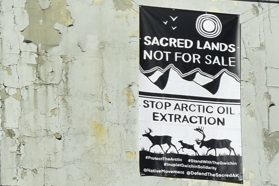 The text of the banner reads “Sacred Lands Not For Sale — Stop Arctic Oil Extraction” and is a reference to the Trump administration’s decision in August to begin leasing tracts of land in the Arctic National Wildlife Refuge for resource development.