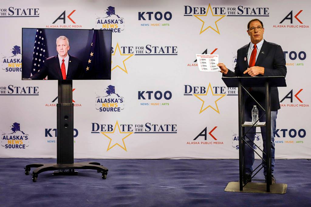 Republican U.S. Sen. Dan Sullivan and Democratic-supported independent Al Gross somewhat shared the Anchorage debate stage; Sullivan, who appeared on a monitor beside Gross, participated from Washington, D.C., where the Senate is preparing to vote on President Donald Trump’s nomination of Amy Coney Barrett to the U.S. Supreme Court.