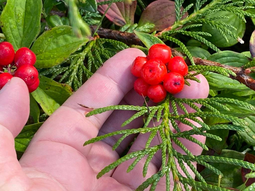 I’d heard those names as a kid, but I’m pretty sure we were mixed up. Bunchberries have a foamy and tasty pulp inside with a crunchy seed. I like the foamy texture and the seed. Some people assume they’re poisonous or don’t care for the taste, but they’re one of my favorite berries and also a favorite food for songbirds and birds migrating south for the winter. People use the leaves for deer calls and there are medicinal uses also.