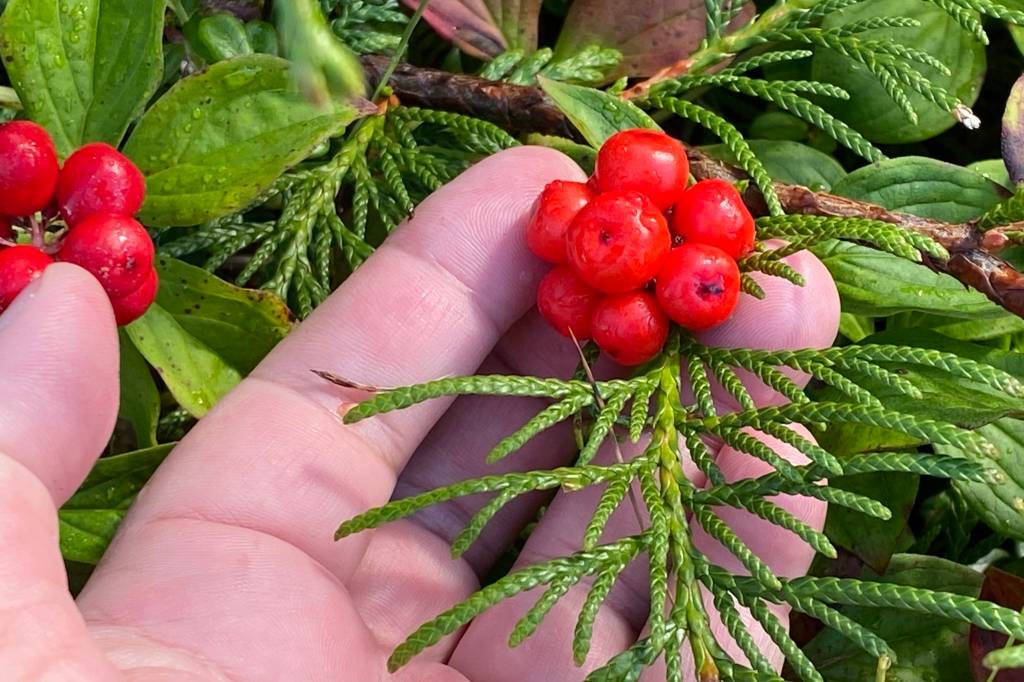 Bright red berries dot the roadside and we pull off on a small turn-out and park. My dad and I, and my dog, Kéet, survey our surroundings: bull pine and spruce draped with moss, a soggy muskeg and reddish-orange berries contrasting with green leaves. I call them bunchberries, Cornus unalaschkensis, and in the Lingít language: k’eikaxétl’k. They’re one of my favorite fall berries.
