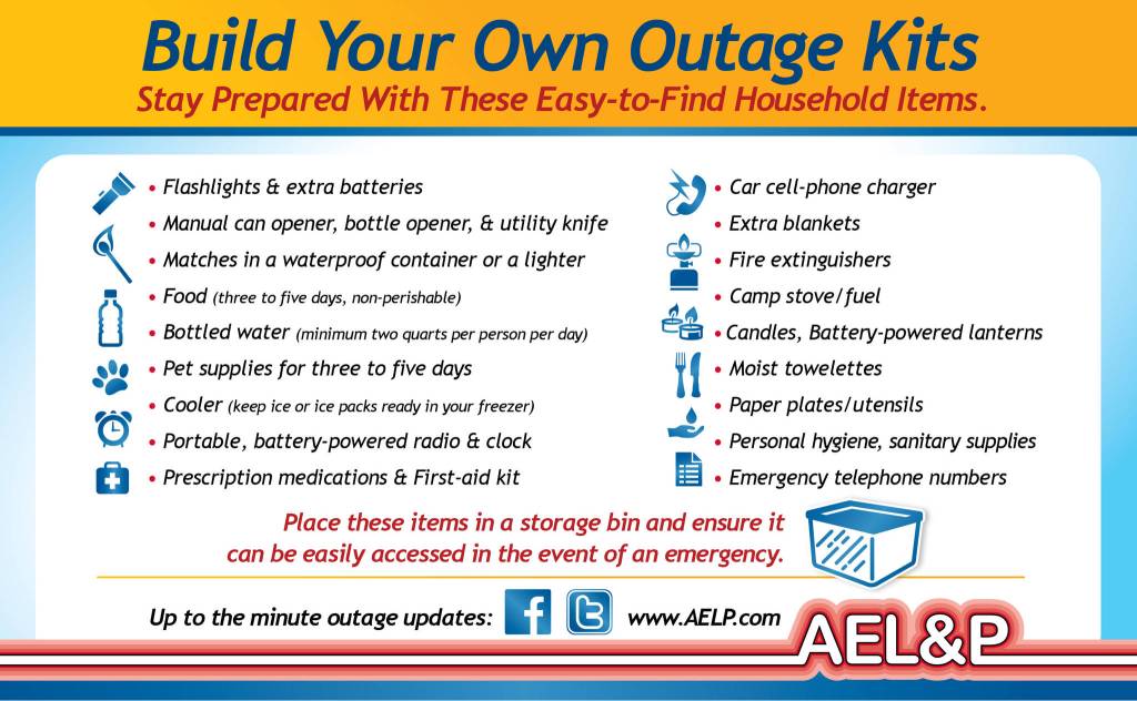 Alaska Electric Light and Power has a recommended list of things to keep in an emergency outage box, ideally grouped together for convenience.