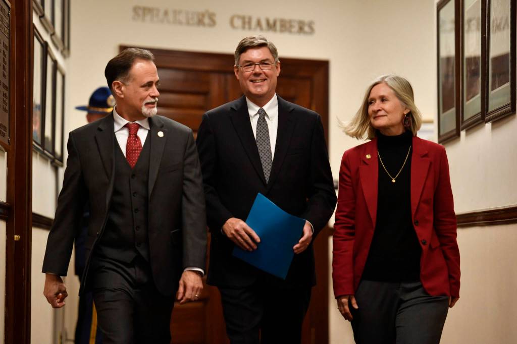 Alaska Supreme Court Chief Justice Joel H. Bolger, center, is escorted to the House of Representatives by Sen. Peter Micciche, R- Soldotna, left, and Rep. Andi Story, D-Juneau, for the annual State of the Judiciary speech at the Capitol on Wednesday, Feb. 20, 2019. (Michael Penn / Juneau Empire File)