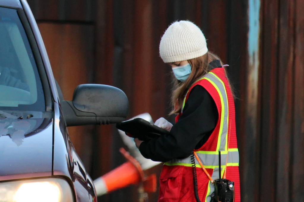 Abby Jones, an emergency worker for Capital City Fire/Rescue, checks in a Juneau resident for free asymptomatic testing on Dec. 31, 2021. (Ben Hohenstatt / Juneau Empire)
