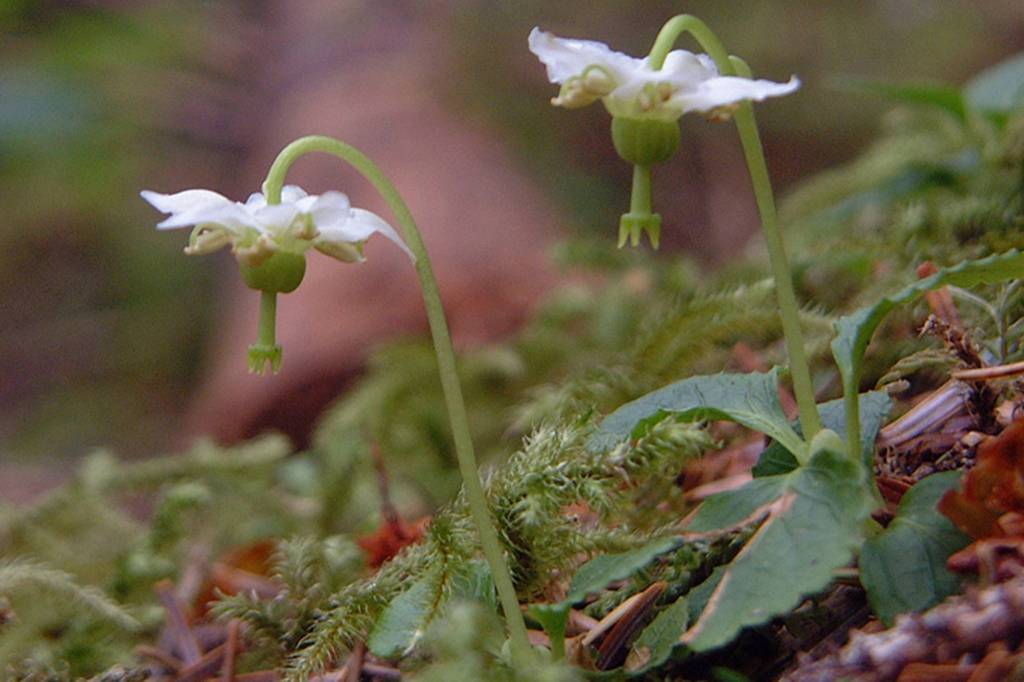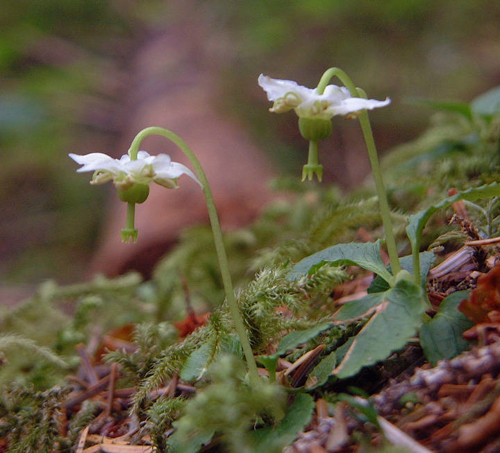 — Single delight or shy maiden: An evergreen member of the wintergreen family, its white flower faces downward until it is pollinated, when the flower raises its face upward, exposing the seed capsule with the tiny seeds to the breezes. The flower is buzz-pollinated by pollen-collecting bumblebees, which vibrate the anthers to release pollen onto the foraging bees.