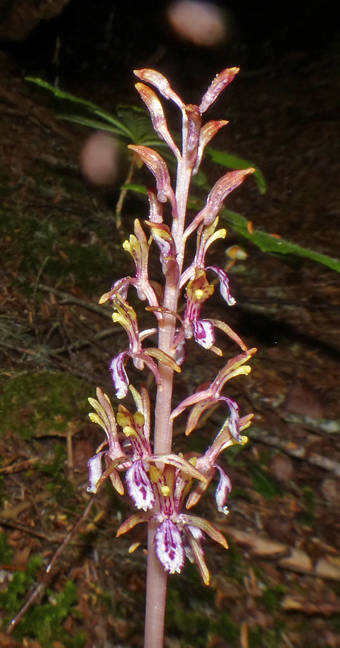 — Western coralroot: Spikes of pinkish flowers on pink stems usually appear in groups. There is no green pigment at all and no capacity for photosynthesis; these plants are indirectly parasitic on trees and shrubs, via mycorrhizal fungal connections, and also may be saprophytic (feeding on decayed organic matter). The flowers are visited by bees.