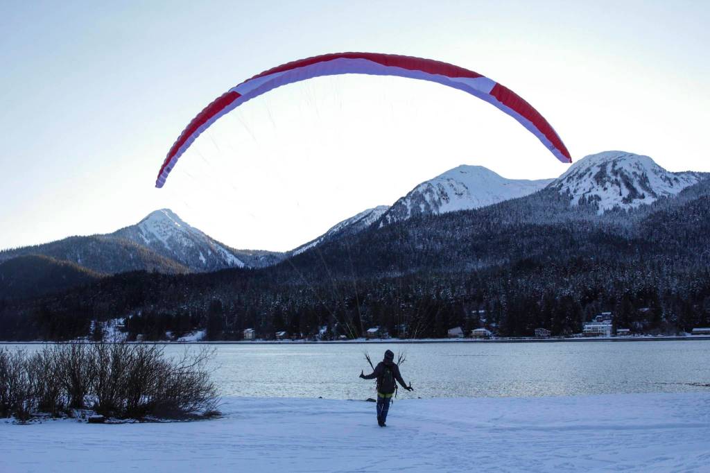 Robert Fawcett familiarizes himself with a new wing alongside the Gastineau Channel at Wayside Park on Jan. 27, 2021. “When you’re up on the mountain, you get more variables, more winds and gusts,” Fawcett said in a brief interview. “The same controls you use in the air, you use on the ground. It’s always good to practice.” Fawcett said he’d taken the wing off a mountain on Monday. “I like the hike up,” Fawcett said. “I don’t like the hike down.” (Michael S. Lockett / Juneau Empire)