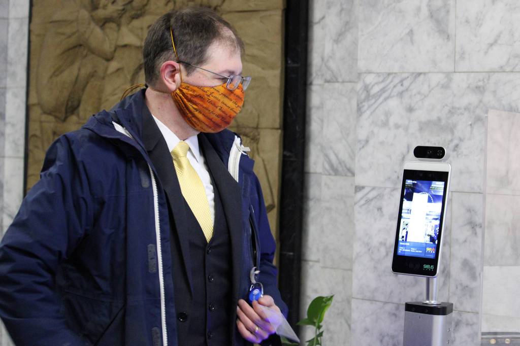 “The temperature screenings are quick and easy,” said Rep. Sara Hannan, D-Juneau. “They seem to prefer you to have your mask not too close to the visual screen.”