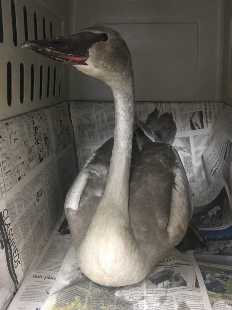 “The swan was used to seeing them. When I approached, he’d back away from me. Birds are like that. They’re suspicious of people they don’t know,” Benner said. “Matt was able to get his arm around him and I was able to come up with the sheeting and take him. It actually went pretty smooth.”