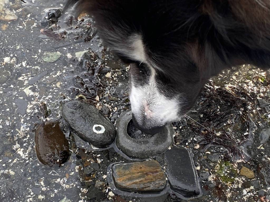 I continue to sweep my eyes left to right, searching. Then, I spot something that looks like a small volcano with a large hole in the center — a moon snail nest. It’s smaller than I imagined. To my right, several more moon snails nests dot another sandy spot. I lean down to inspect the nest’s delicate sandy surface. Kéet sniffs it but loses interest. She’s more focused on what I could have in my hands to toss for her fetch game.