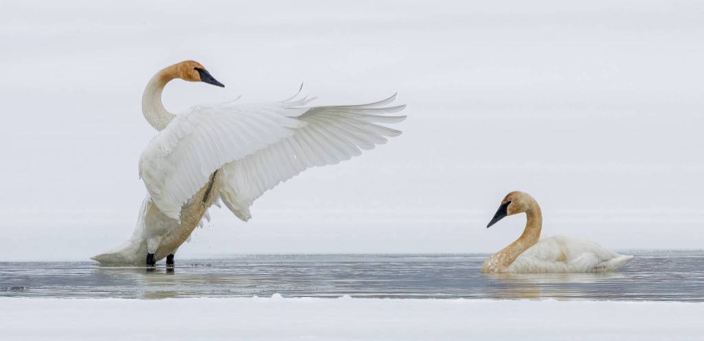 Trumpeters migrate through here in spring and fall, and occasionally overwinter in estuaries and ice-free freshwater ponds. We see them in various places, including Amalga and the Dredge Lakes area. They are probably from the population that nests in coastal areas farther north; those that nest in the Interior are more likely to migrate inland. They have a huge wingspan, similar to that of eagles, but they are much heavier; they are said to be the heaviest flying bird in the world.