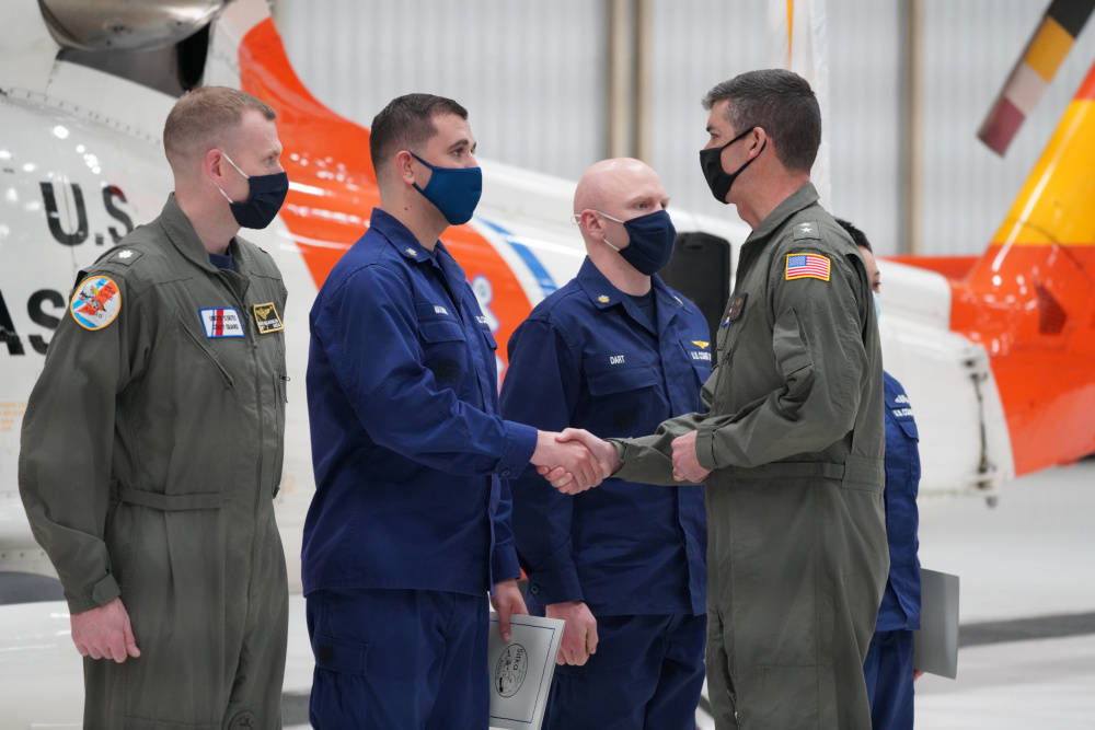 Air Medals were awarded to pilot and copilot Lt. Justin Neal and Lt. Jonathan Orthman as well as to flight mechanic Petty Officer 2nd Class James Schwader and rescue swimmer Petty Officer 2nd Class Grant Roberts.