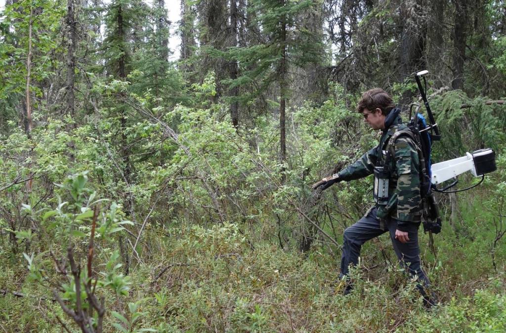 To the delight of the local mosquitoes, Nicholas Hasson steps through a tangle of prickly spruce branches while wearing a backpack that holds a scientific instrument.