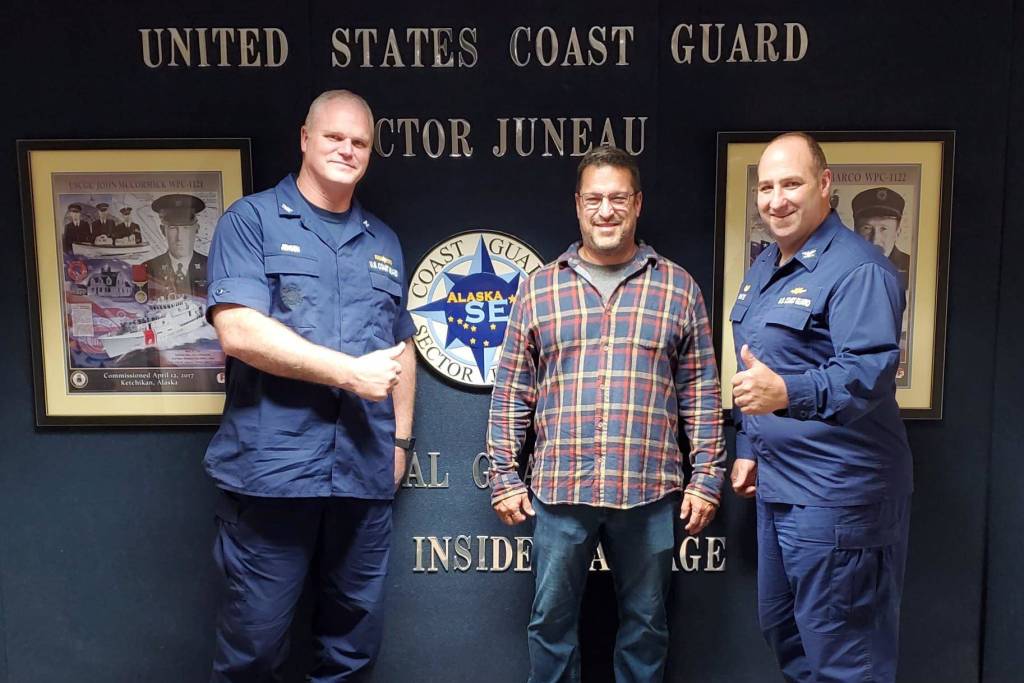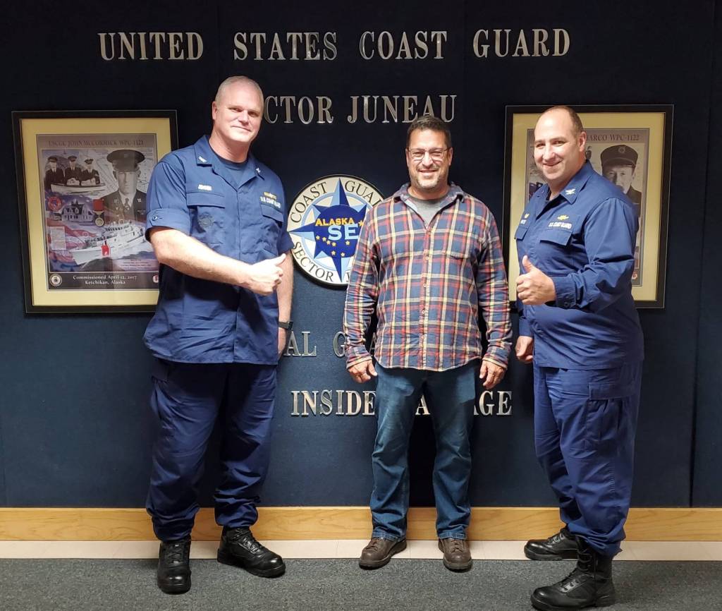 Incoming Coast Guard Sector Juneau commander Capt. Darwin A. Jensen, left, and outgoing commander Capt. Stephen R. White, right, congratulate Herman Cestero, center, for his quick action in rescuing a fisherman in distress on June 24, 2021. (Michael S. Lockett / Juneau Empire)