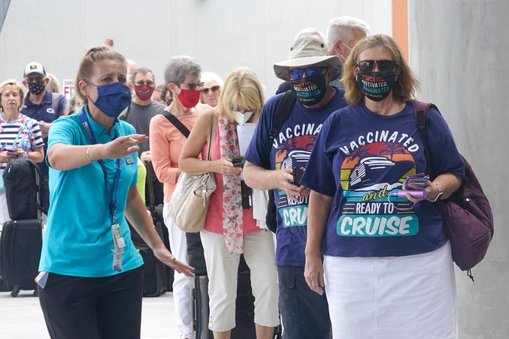 Passengers arrived with matching T-shirts that read phrases such as “straight outta vaccination” and “vaccinated and ready to cruise.”