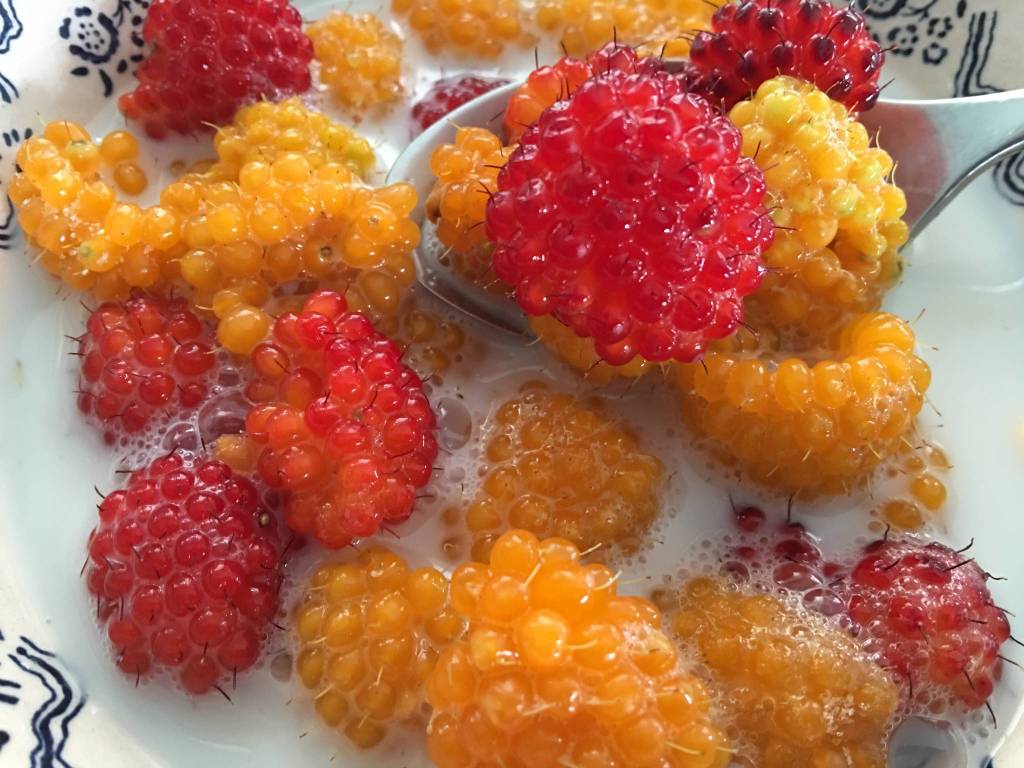 “Yes, they’re tart,” I say. The taste brings me back to a dusty neighborhood road above town, and I’m there, a child unable to wait for salmonberries to ripen, eating them as I pulled my wagon along.