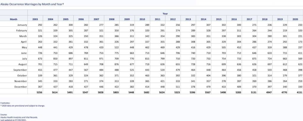 This table shows the number of marriages in Alaska by month and year according to the Alaska Department of Health and Social Services, which issues marriages licenses. DHSS staff noted the data for 2020 is provisional and subject to change. (Courtesy Image / DHSS)