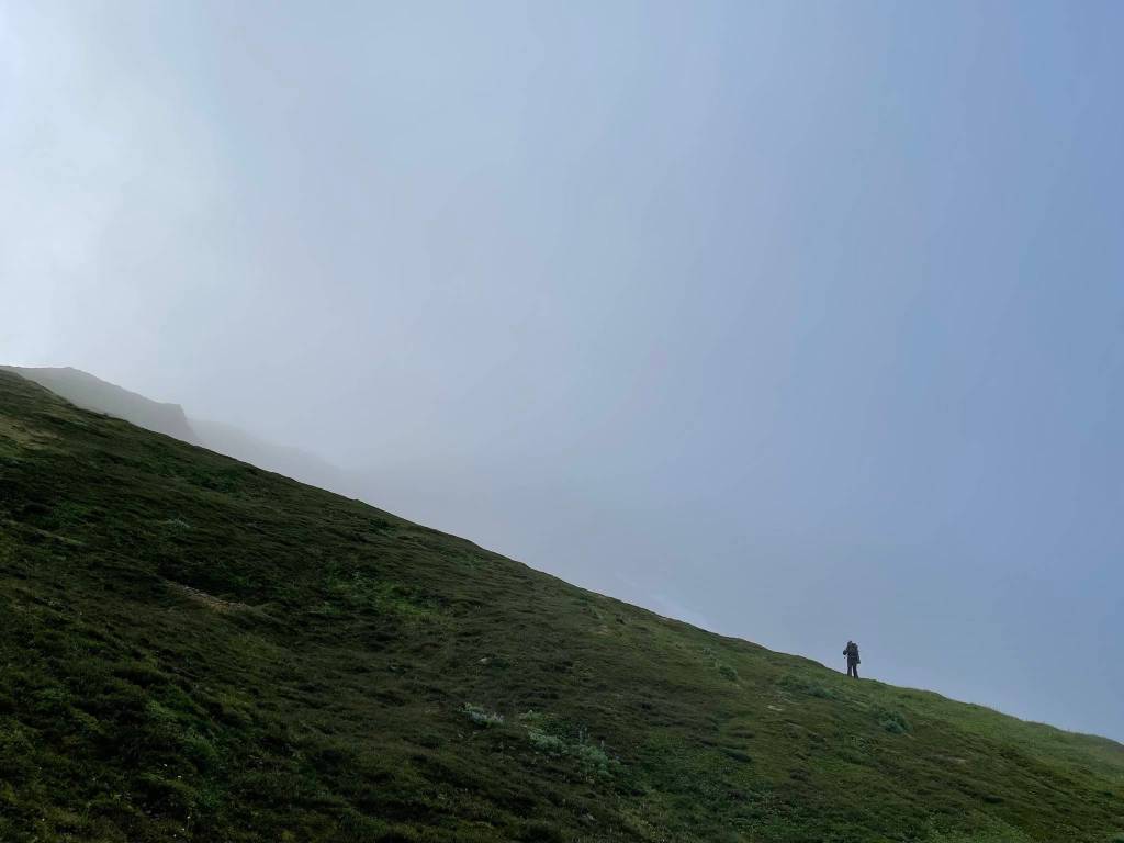 So we staggered up the last 1061 vertical feet in .6 miles into the thin and fragile but stubborn fog. The mountain was steep and consistent, not rocky and technical — the type of terrain that best reveals the exact type of shape you are in. You can catch your breath while deciding which line looks the best. When it’s just steep, there are no excuses. You either need a break or you don’t, and if you do, there’s nothing wrong with it.