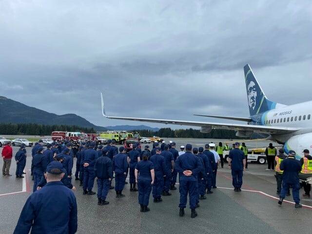 Coast Guardsmen stand in formation at Juneau International Airport as the body of Chief Petty Officer Jeffery DeRonde, who died over the weekend, is loaded on an airplane on Sept. 7, 2021. (Courtesy photo / Capital City Fire/Rescue)