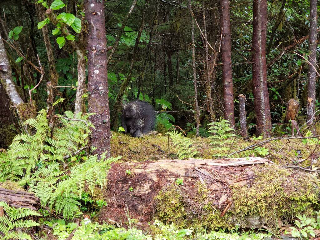 A walk up the Salmon Creek road with friends found that the some of the many self-heal plants, seen in bloom on a previous walk, were setting seed. By the side of the road, we found several quite handsome, large beetles with reddish-brown carapaces (I think I used to know a name for them). On the way up, we all simultaneously spotted a porcupine trundling along the side of the road ahead of us, and we stopped to watch it. Moving away from us at first, it turned around and began snacking on some roadside greenery. We tried to slither by, but it scuttled into the brush, just a little way, where it sat watching us and shaking its wet fur. We went on, and it came right back to its green lunch. As we came back down the road later, it was still there and made a repeat performance. That must have been a particularly nice meal, not to be abandoned. Near the water tower, we spotted two deer, looking smooth and sleek; one of them stayed to watch us pass by, ears up like flags.