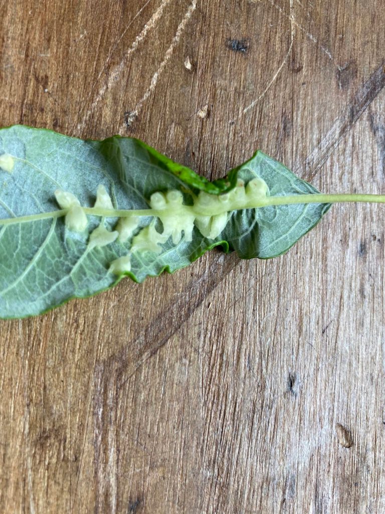 Not far away, there were lots of galls on some willow leaves, mostly near the veins. Pointed underneath and reddish on top, they might be the temporary homes of larval gall midges (possibly an Iteomyia species). These seem to be better studied in Europe than in North America, but I found no details of the biology and life history. In general, the tiny female fly lays eggs on the leaf; when mature, the larva drops to the ground to pupate for the winter.