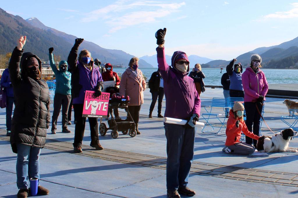 Masked people raise their fists in the air during the 2020 Juneau women’s march and rally at Mayor Bill Overstreet Park.