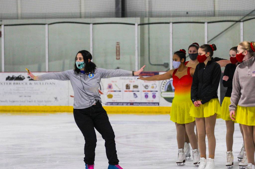 Coach Leah Farzin of Juneau Skating Club Team Forget-Me-Not instructs skaters on Oct. 31, 2021 as the team readies for an upcoming travel competition in California.