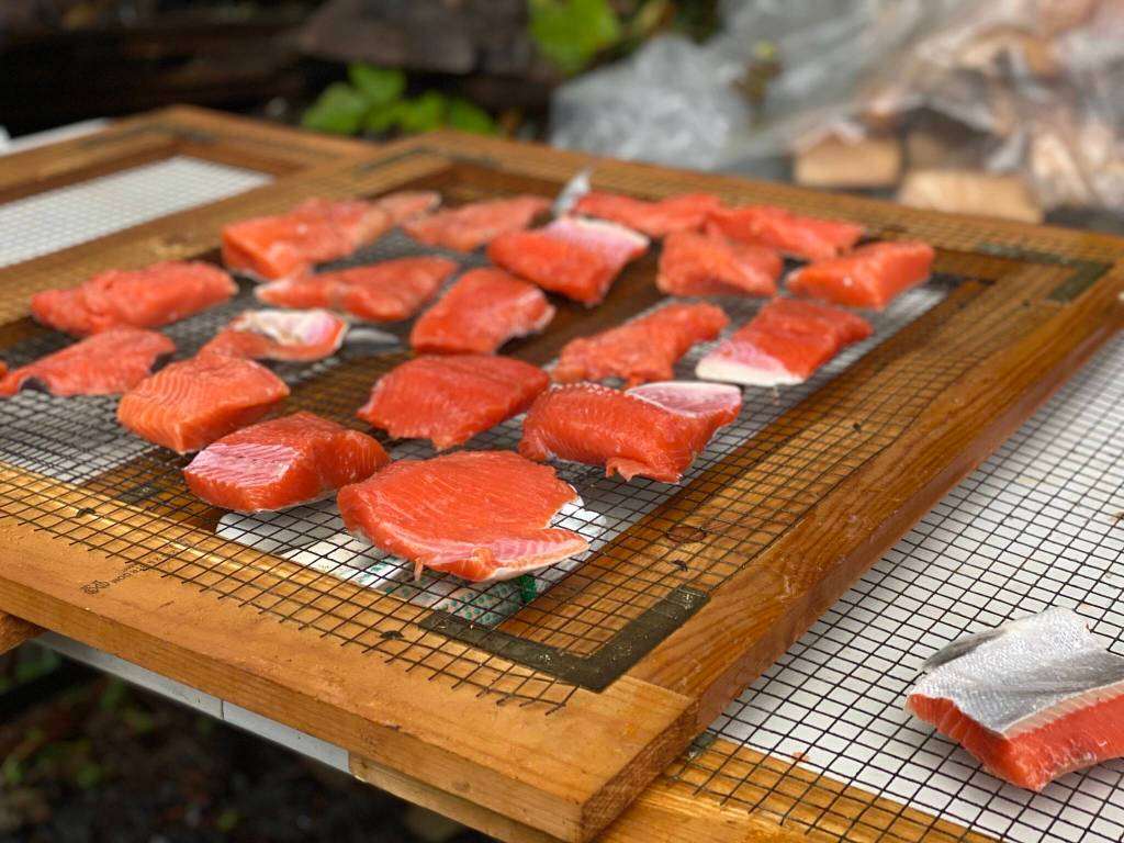 After the coho slices have brined, my dad pulls the plug on the tank, and it drains. Together, we dump the slices onto a rack that’s been laid out on the table. I place the slices on another nearby rack, skin side down, and when the rack is full, I help my dad slide the rack into the smokehouse. We fill up five racks with coho.