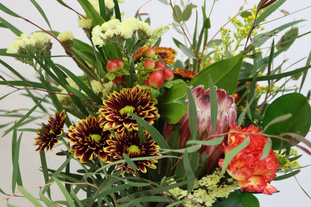 Local florists suggest using seasonal colors and flowers in Thanksgiving arrangements. Deborah Clements, owner of Martha’s Flowers in the Mendenhall Valley, created this display, which features the last of the season’s button mums and a bronze chrysanthemum.