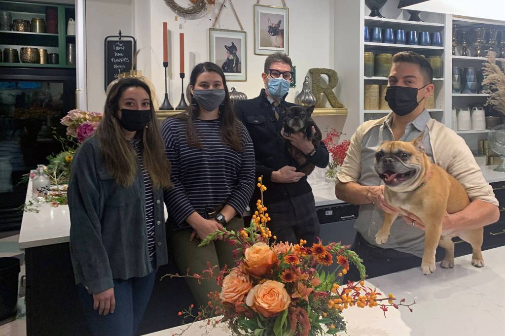The staff at Frenchie’s Floral Studio downtown takes a break from preparing Thanksgiving arrangements on Friday, Nov. 12. Florist Heather Alducin, (left), floral designer, Nikki Box, (second left), stand with shop owners Jeremy Bauer, (center right), and Jason Clifton, (right). French bulldogs George (held by Bauer) and Gracie (on table), served as the inspiration for the shop’s name.