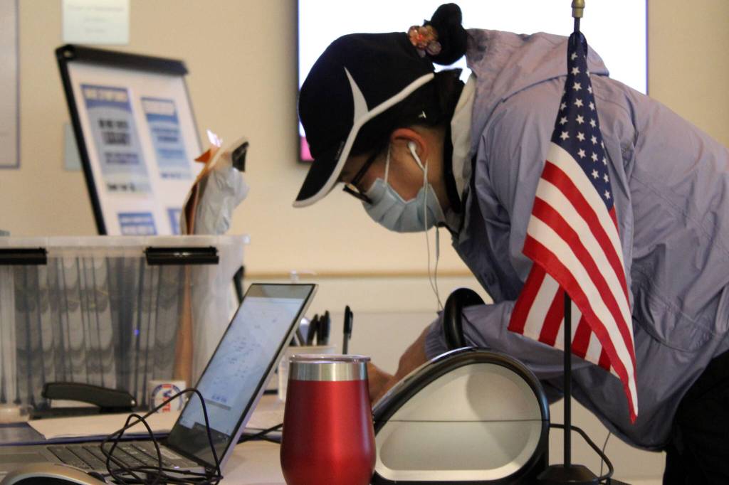 In this Empire file photo, Juneau citizen Mary Ellen Yadao signs her name to vote in the City and Borough of Juneau Municipal Election on Oct. 6, 2020. Speaking to a panel of cybersecurity experts Thursday, Lt. Gov. Kevin Meyer said the state is taking advantage of federal resources to bolster election security. (Ben Hohenstatt / Juneau Empire file)