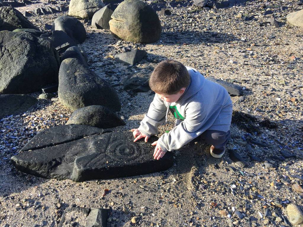 My son, Mitch, takes his first son, Owen, down to the Petroglyph Beach. We walk around the rocks, pick up shells, wade in tidepools. Together, we lean over the rock and trace the killer whale fin. Grandson Owen feels the ovoid eyes, the high dorsal fin, as if the artist is moving his hand, gouging the rock.