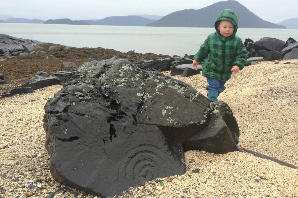 Ten thousand years later, Grandson Jonah toddles around the petroglyphs. “We’re visiting the ancestors,” I tell him. His mom, Nikka, takes his hand and traces the spiral glyph round and round. Soon, he’s wandering around finding glyphs on his own. Gray clouds pull down a cover over nearby islands and a bald eagle glides above us. I imagine the artist with his carving tool, gouging and pecking at the rock. I take the time to give thanks: Gunalchéesh. Gunalchéesh Shtax’héen Kwáan.