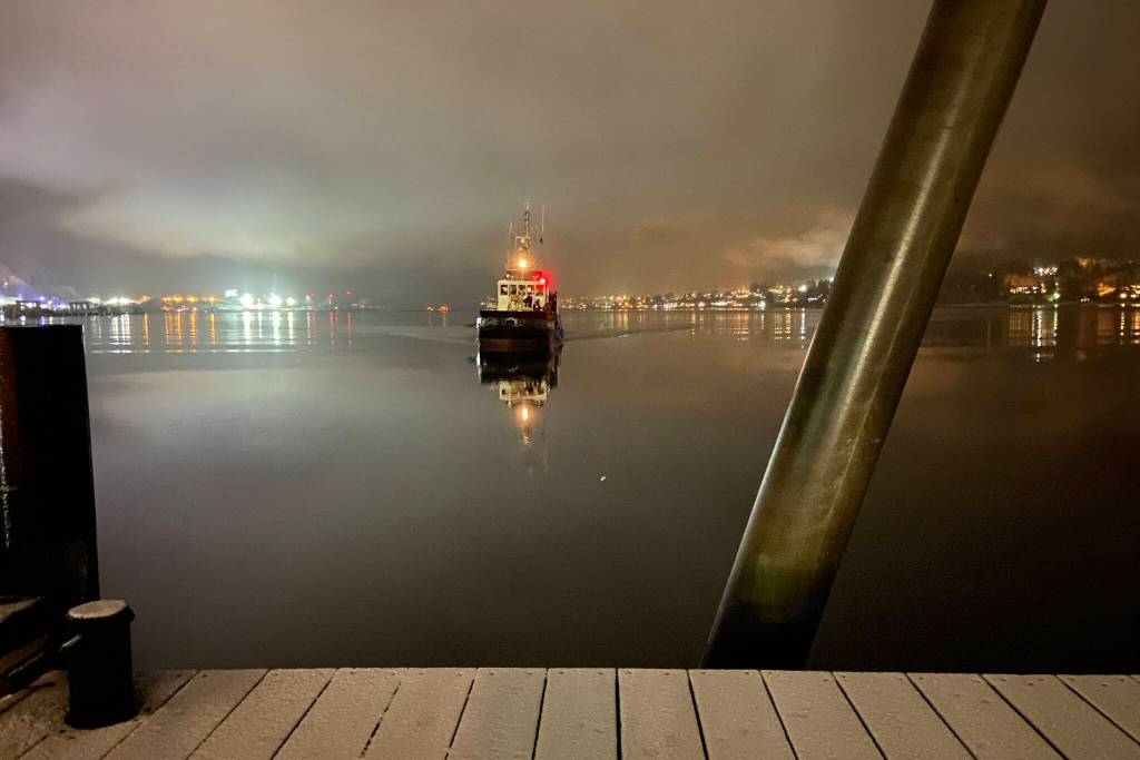 U.S. Coast Guard Cutter Elderberry arrives in Juneau late on Nov. 27, 2021, bearing the Christmas tree due for the Alaska Governor’s Mansion from Wrangell. (USCG photo / Chief Petty Offcer Kip Wadlow)