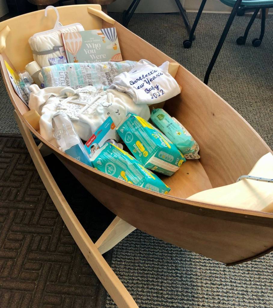 This photo shows a wooden boat built by Dr. Lindy Jones filled with a basket of goodies for the first baby born in Bartlett Regional Hospital in 2022. (Courtesy Photo / Lauren Beason, Bartlett Regional Hospital)