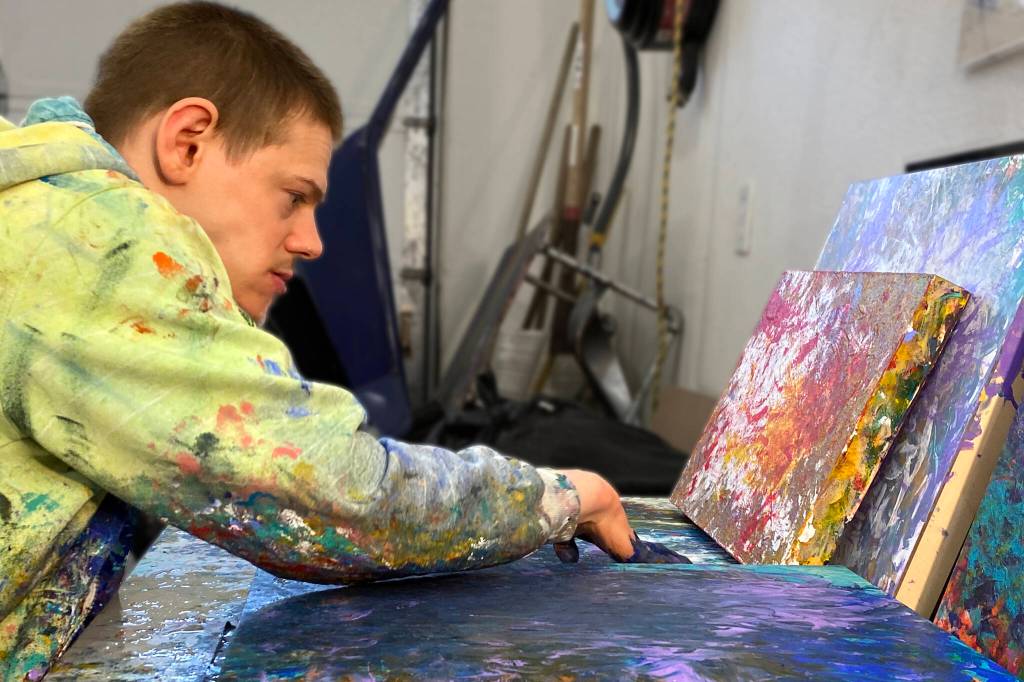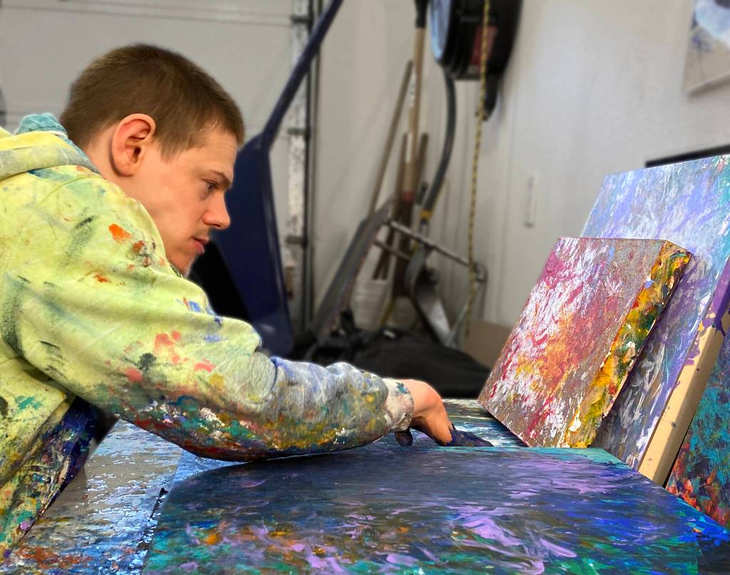 Avery Skaggs works on a painting. Skaggs’ work will be featured in an exhibit at the Juneau-Douglas City Museum that is opening on First Friday. (Courtesy Photo)