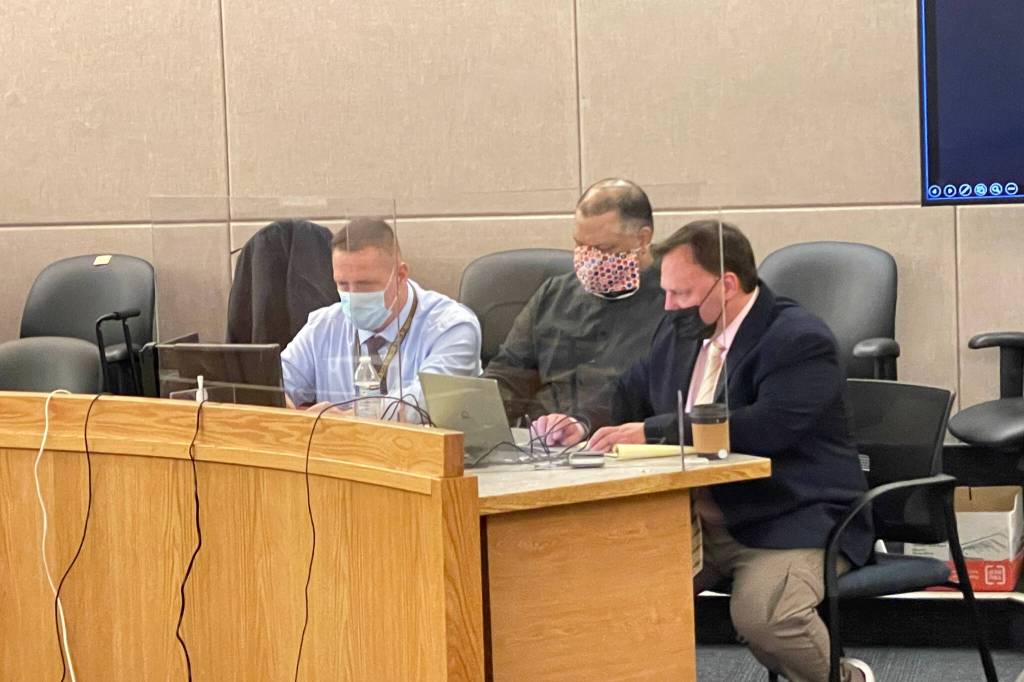 Investigator Markus Bressler, defendant John Stapleton, and public defender Eric Hedland sit in court on Jan. 13, 2022. (Michael S. Lockett / Juneau Empire File)