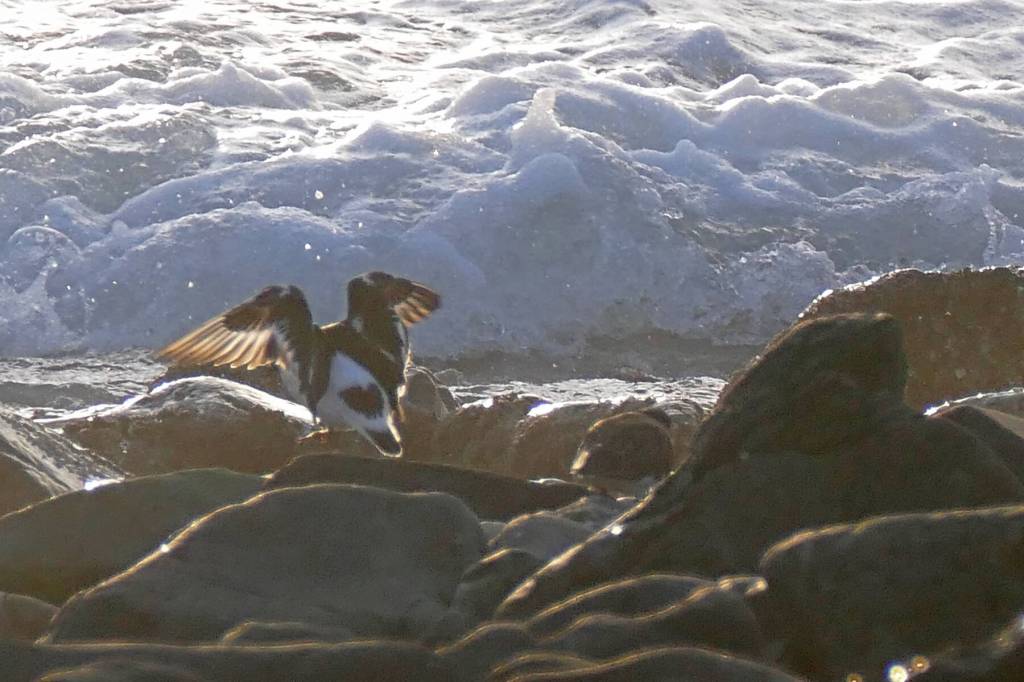 Black turnstone: In winter, it’s mostly on rocky shores and reefs, headlands, but also on deltas and mudflats; it may attend late runs of anadromous fish in streams. They feed on intertidal invertebrates in winter, including lots of small limpets.