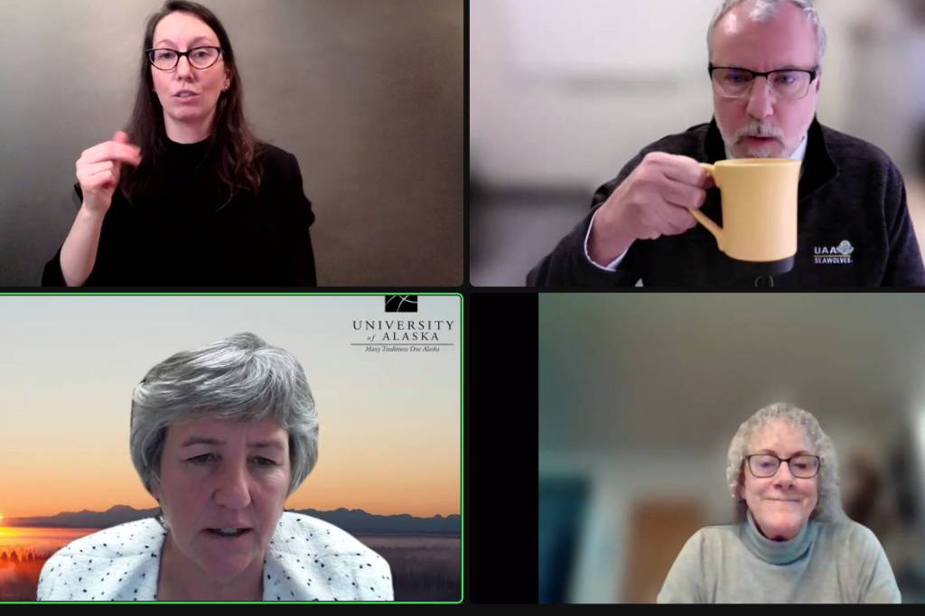 University of Alaska Interim President Pat Pitney, bottom left, spoke to UA students in a virtual forum on Thursday, Jan. 27, 2022, and was joined by several UA administrators including UA Southeast President Karen Carey, bottom left, and UA Anchorage Vice Chancellor Bruce Schultz, top left. At top right, an American Sign Language professional provides translation services. (Screenshot)