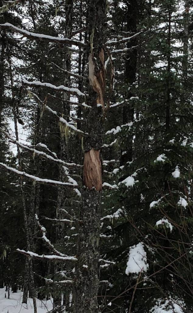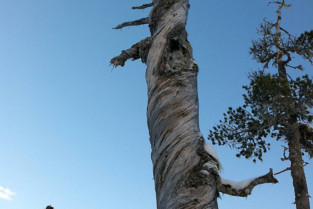 Strolling on snowshoes around the Lower Loop at Eaglecrest one gray, damp day, we found, as expected, that conditions for reading animal tracks were bad on the rain-packed snow. So we counted trees instead: we had noticed previously that some of the dead or dying pines in the meadows had very twisted trunks, mostly with an upward twist to the right. So this time, we counted the pines with right or left twists and also checked whatever dead hemlocks or spruces we encountered. This informal, unscientific survey produced a series of questions, largely unanswered.