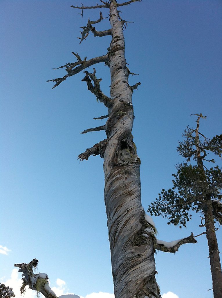 —As luck would have it, on the return loop, we spotted a long-dead tree, probably a pine, that had broken off near the base, exposing a central core of straight-grained wood surrounded by many layers of twisted wood. Something apparently had changed as the tree grew—the older growth rings made straight wood but the later growth rings made twist. But what?