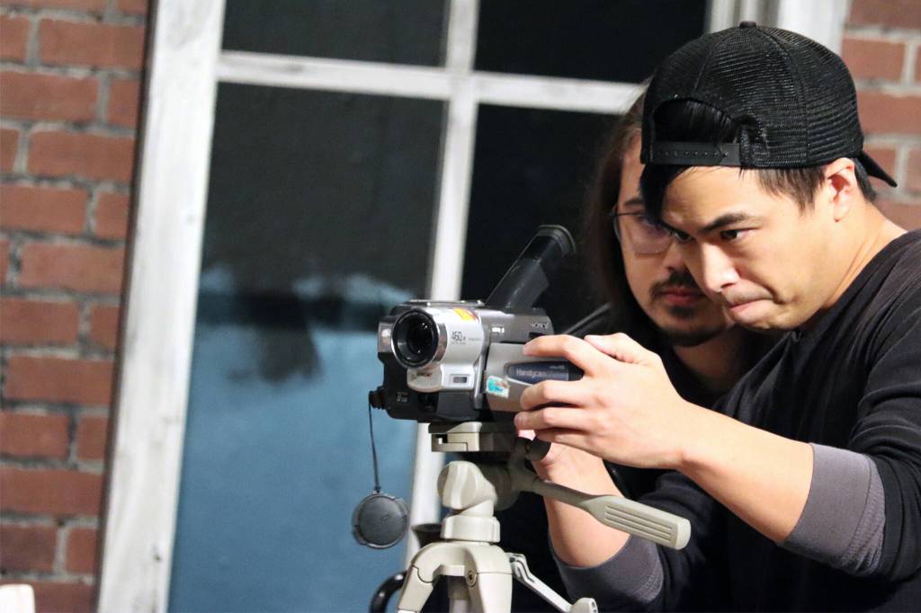 Max (Mike Rao) and Visarut (Phai Giron) look at a camcorder during a paranormal investigation during a rehearsal for Perseverance Theatre’s “production of The Brothers Paranormal.”
