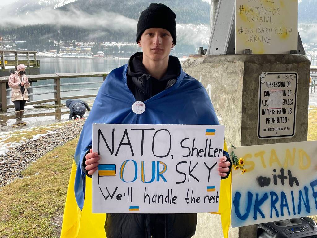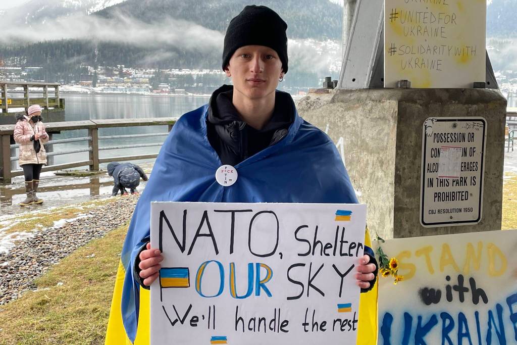 Draped in the Ukrainian flag, Tkachenko was holding a sign that read “NATO, shelter our sky — we’ll do the rest,” as he advocated for help securing Ukrainian airspace against Russian aviation assets dropping bombs and airborne forces across the country.