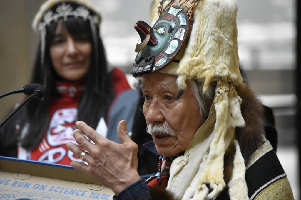 Yéil Yádi Nathan Jackson speaks at a ceremony at the State Office Building on Friday, March 11, 2022. A totem pole originally carved by Jackson in 1980 was reinstalled in the building’s atrium after spending years in storage. (Peter Segall / Juneau Empire)